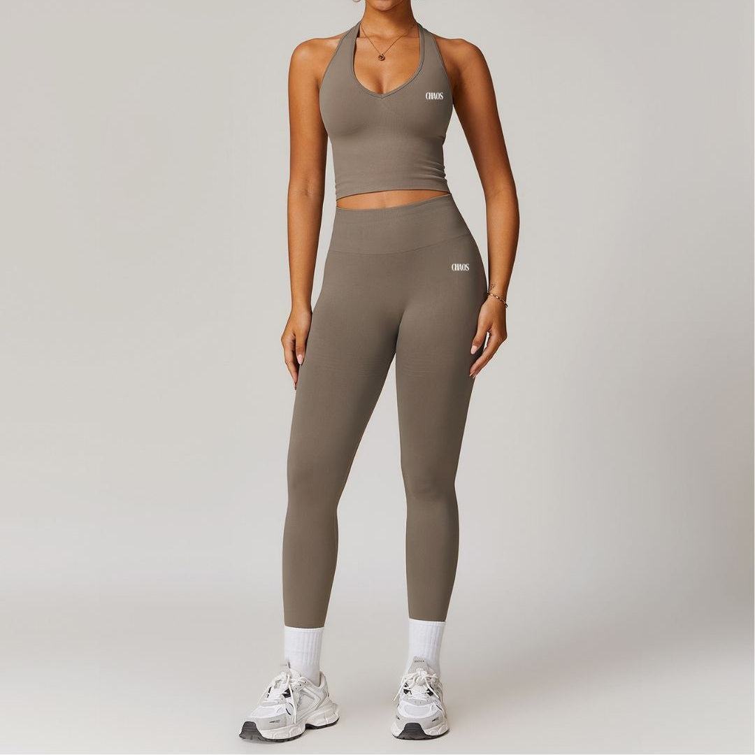 THE FUEL SET - Storm Sand is jouw stille kracht: strak, functioneel en altijd klaar om te bewegen. De haltertop biedt support én bewegingsvrijheid, terwijl de high-waisted legging je core omhult met een stevige, maar ademende grip.